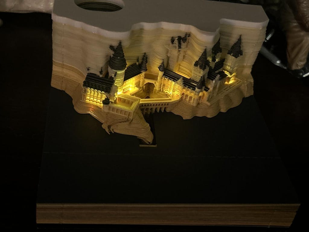 I ordered this because we are Harry Potter fans and I thought this looks like a unique idea. In order to test out how it works, I had to destroy it prior to the year it’s made for - doh! But it is a pretty cool reveal. Once we had torn off about half of the weeks (and note that the calendar pages are not individual days, but labeled in chunks by each week), I finally switched on the light. At first, I thought my wiring was bad, because only the left side of my half-revealed castle was lighting up. However, after we removed about 25% more pages, I tried out the lighting again and found that the whole castle was indeed wired up with light, nice! It’s amazing how intricate some of the sections turn out, knowing that the cliffs are carved out of stacked paper. I haven’t removed some of the bottom sheets yet, but we pulled off enough to get the gist and take photos of the turn out. While I would say this is more of an elegant gift for a Harry Potter fan than a calendar, it is still a cool, unique gift that some fans of the series are bound to love.