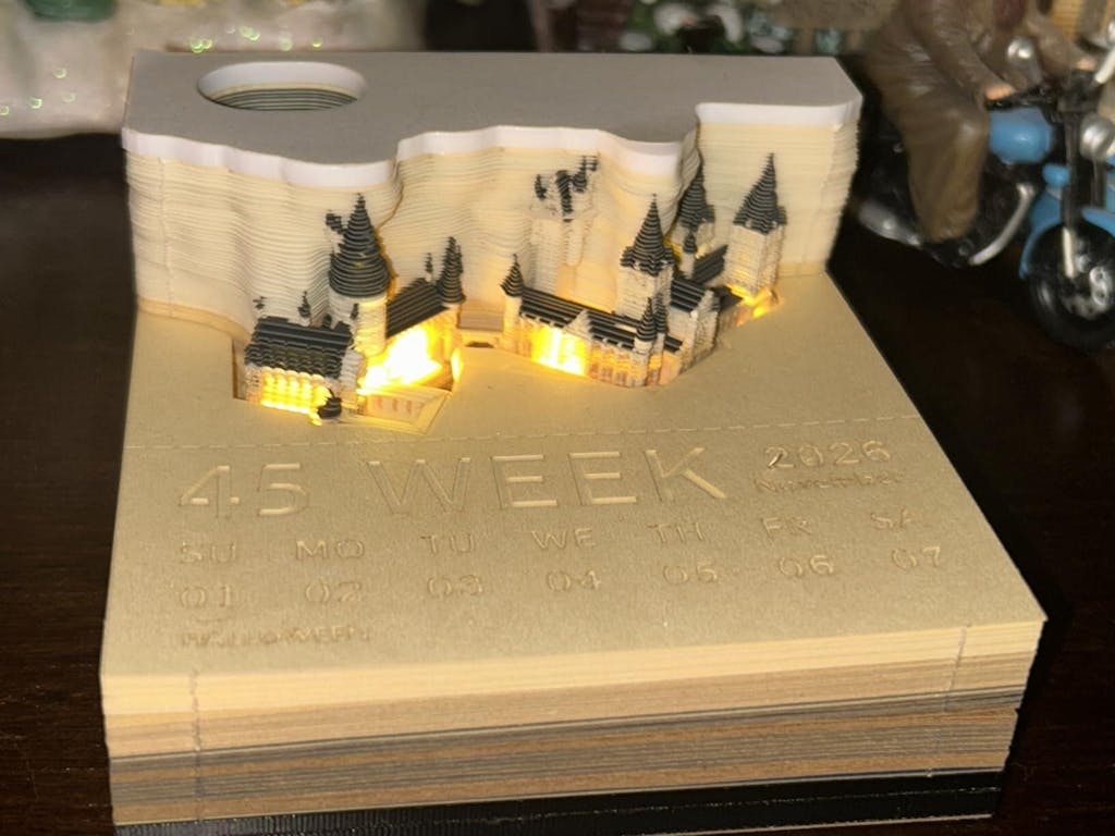 This desk calendar is such a fun and creative piece—I went ahead and tore all the pages out right away for the sake of giving a full representation of the product, and I couldn’t be happier. The clear case makes it look clean and modern and dust-free, while the castle design that emerges as the weeks pass is absolutely stunning. The built-in lights add a warm, enchanting glow, and I love the thoughtful addition of a pencil holder, which makes it both decorative and functional for my home office desk.