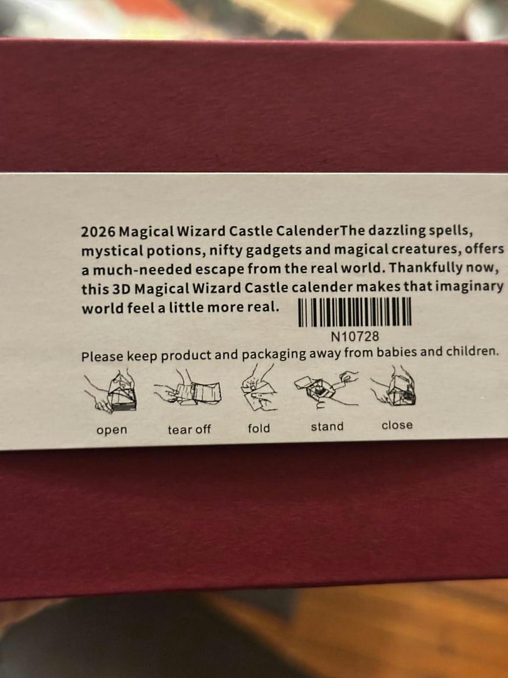 I like to purchase calendars as gifts for the holidays. This calendar is like no other I have seen. You remove a bit of each page and by the end of the year you have a wizardry-looking castle with a light and an acrylic box to display it. I will tell you that it is only weekly but if you have it on your desk at work, it can be a nice thing to do at the start of the week.